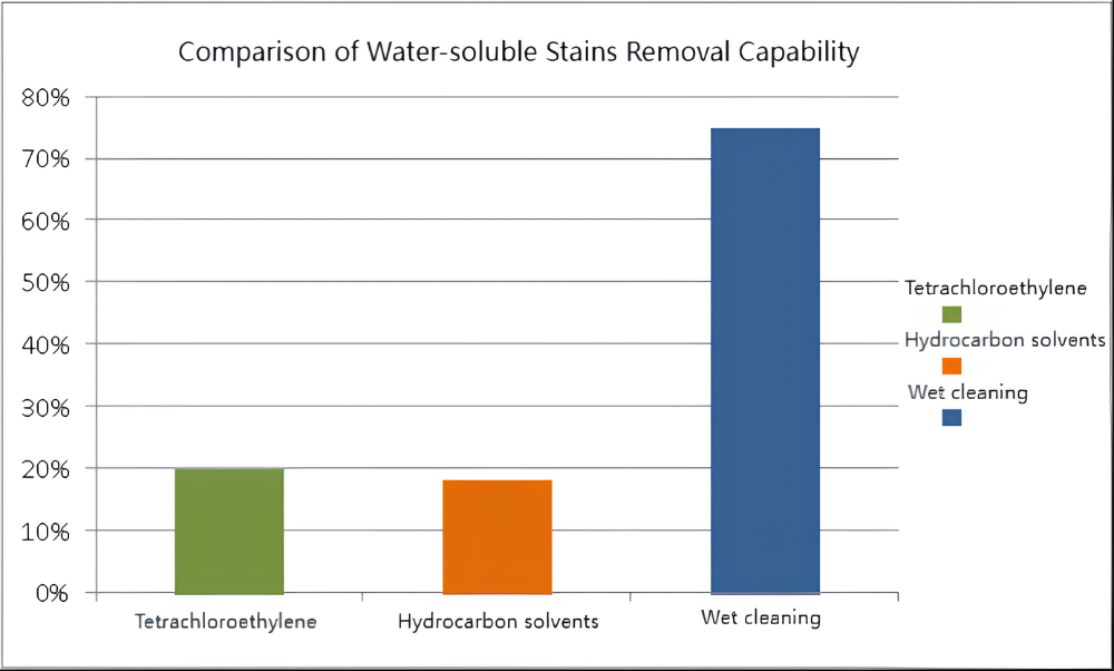 Märkäpuhdistuksella on voimakkain vesiliukoisten tahrojen poistokyky, joka voi olla jopa 75 %. Seuraavaksi tulevat tetrakloorieteeni ja hiilivetyliuottimet.
